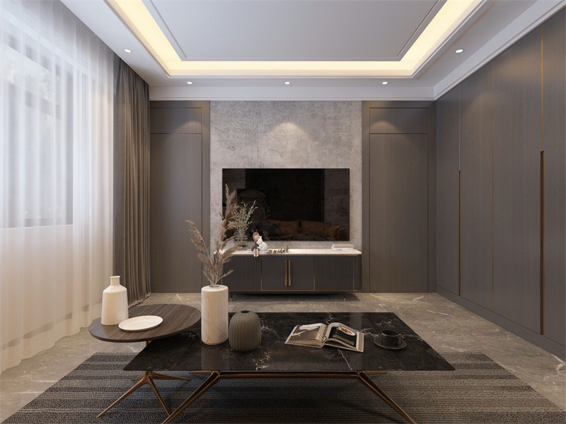 玄关区域空间有限,做灰色调满墙玄关柜设计,实现转场和收纳的空间功能需求,同时也为室内奠定设计基调。
