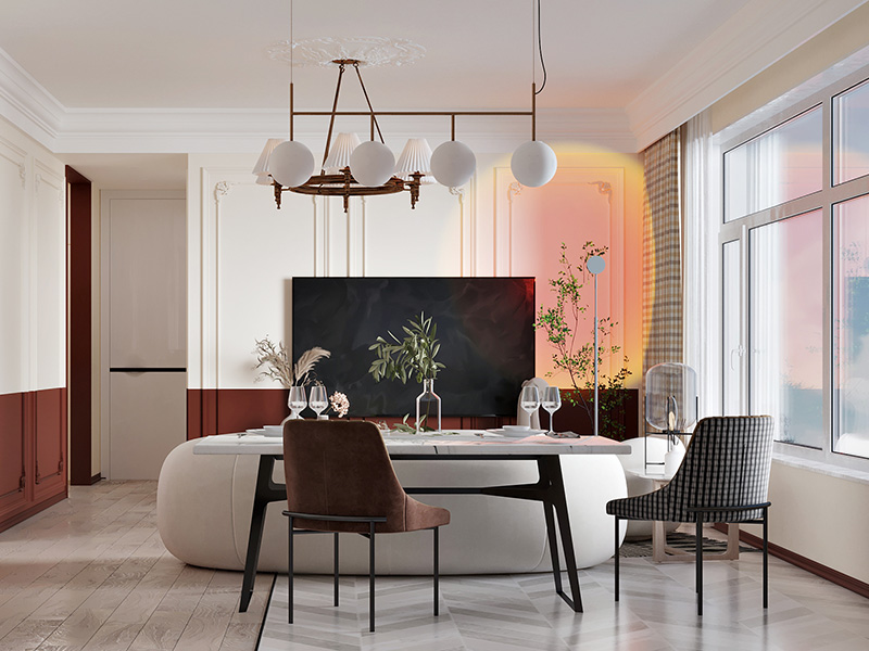 白与复古红墙漆拼接,并用简洁法式线条和雕花做点缀,呈现简雅时尚的电视背景墙。融入细腻柔和的家居软饰,诠释现代法式家居的浪漫优雅。