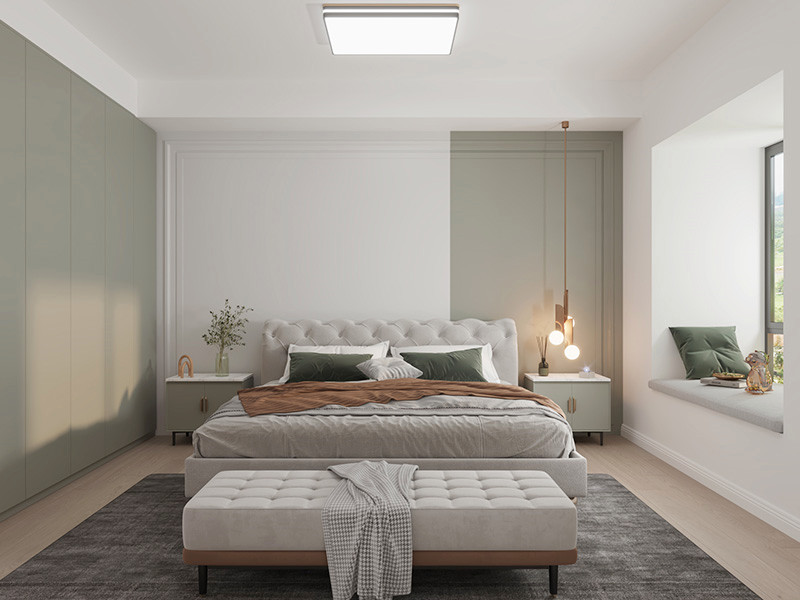 卧室作为休憩空间,在装修时要重视光源设计,用光线柔和的灯饰营造温馨的居住氛围。同时建议增加小夜灯等,方便起夜时照亮使用。窗帘建议使用双层窗帘,或者直接选择遮光好的窗帘,避免午休时被刺眼阳光困扰。