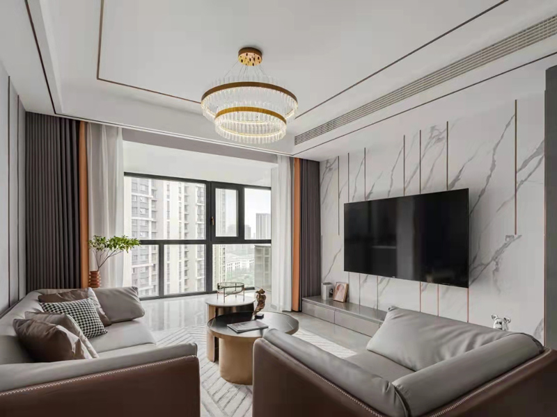 客厅天然的大理石背景墙让自然质朴的气息充斥空间的每一个角落,沙发与单椅呈半围合状态,带来舒适与亲近之感。