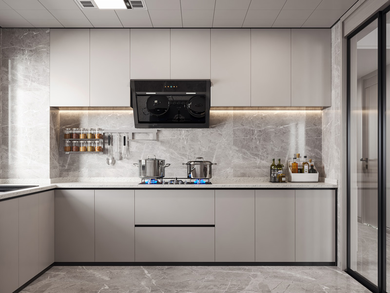 细节的橱柜拉手影响也是很大的,有拉手的设计会在视觉上让空间更繁复,而采用无拉手的形式可以保证空间统一性,让整体更整洁。