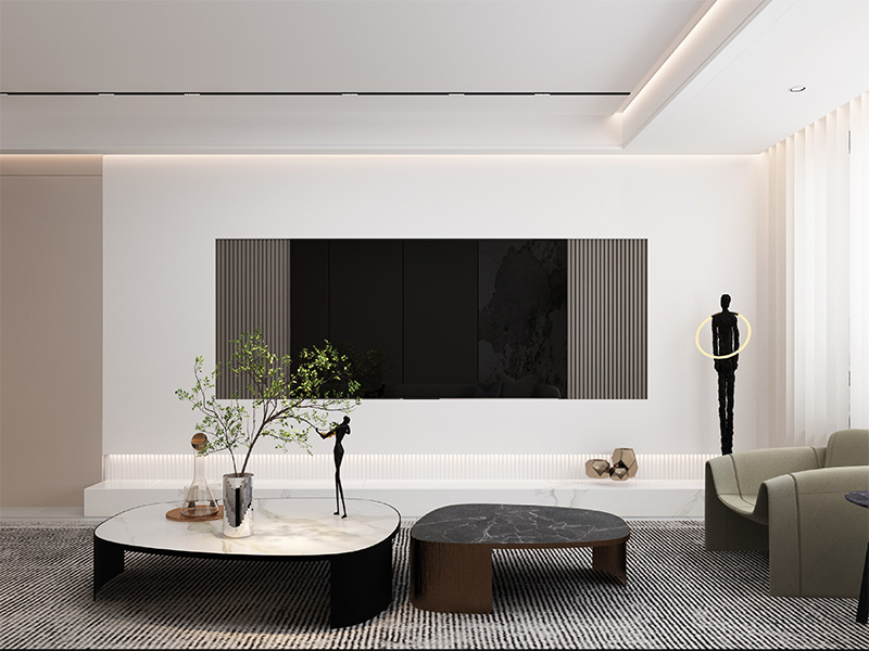 在现代风格、后现代风格等装修风格的家居空间,多采用石与木的视觉碰撞,呈现简洁大气的电视背景墙设计。