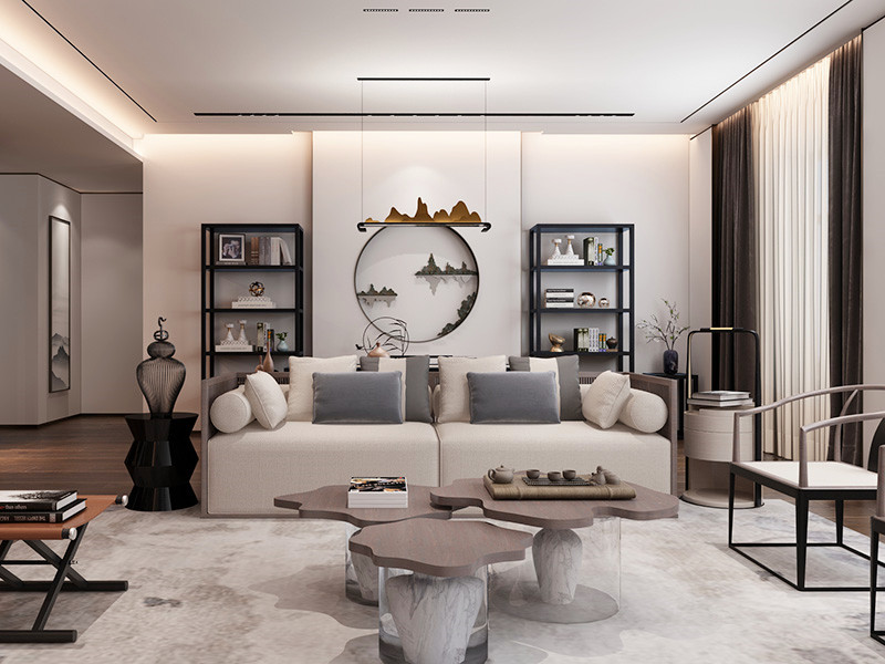 以淡雅的色彩作为空间主色调,采用硬包+木饰面等结合的形式设计沙发背景墙,并用传统中式墙饰做点缀,与组合沙发相搭配,诠释新中式家居的对称美学。
