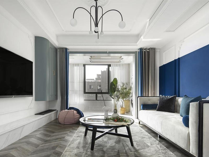 沙发背景墙并没有刷满克莱因蓝墙漆,有做适当的留白,用色彩差异呈现空间干净、明亮的视觉感受。在留白处点缀装饰挂画,遮挡空间的强电箱,既呈现视觉上的和谐美感,又增加空间颜值。