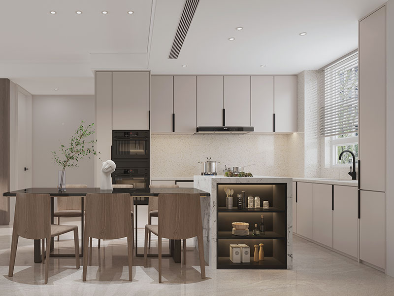 在厨房、客厅等室内空间,可以融入中岛台设计,可增加备菜等的操作台面,也可以作为早餐桌使用。当然,考虑空间的储物能力,也可以将收纳设计融入中岛台,丰富其实用功能。