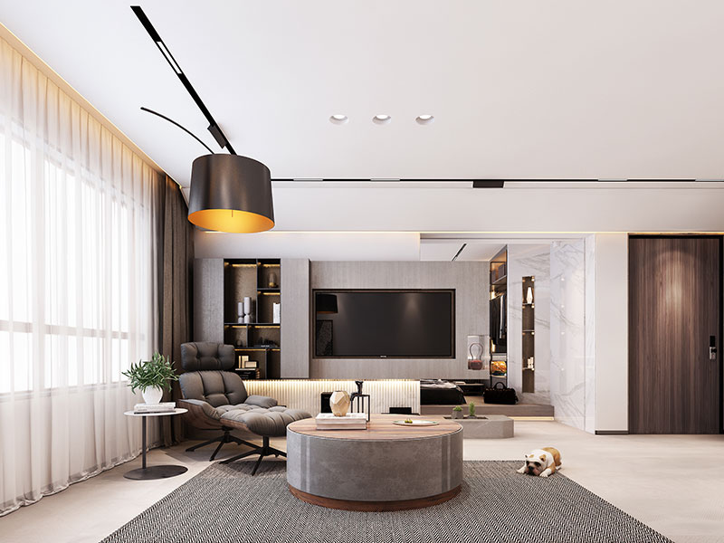 本案定位于现代风格,巧用彰显自然质感的色彩和材质等,并结合开放式布局和通透隔断设计,将生活与功能相结合,打造优雅时尚、宽敞舒适家居。