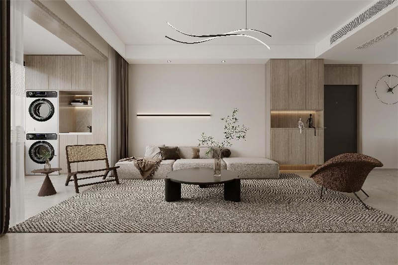 如果入户门与墙体之间距离充足,可以靠墙设计一面玄关柜,留出换鞋区、收纳区、挂衣区和置物区等区域,满足业主的各种需求。