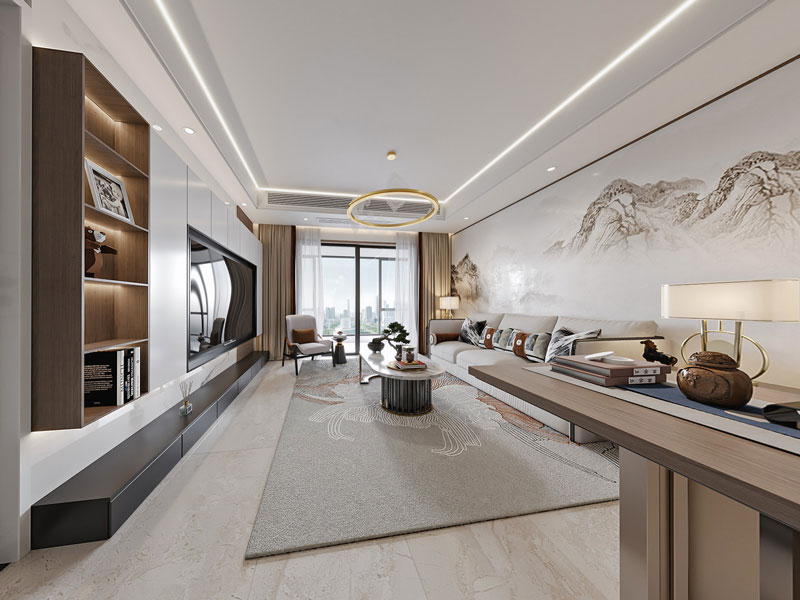 客厅韵味十足,背景墙采用大面积水墨背景,为空间增添了独特的视觉氛围,营造大气雅致的会客环境。