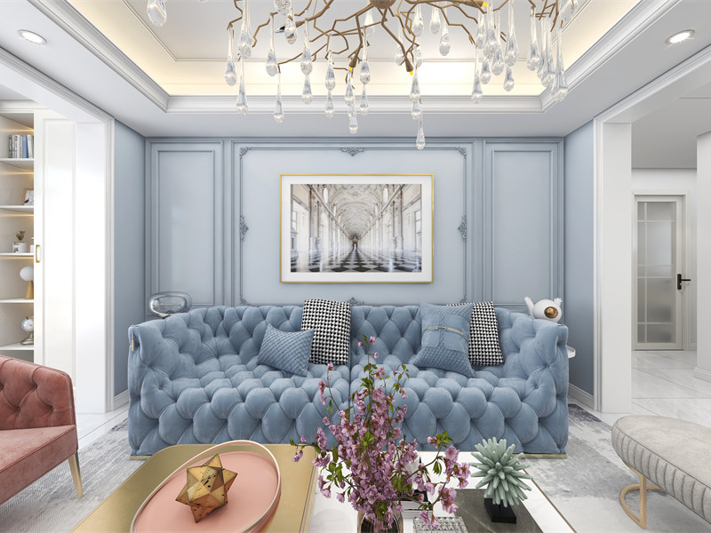 沙发背景墙与电视背景墙相互辉映,以流畅的线条进行对称美学的展现。淡蓝色系中的知性美中融入慵懒的气息,融入其中感受放松的家居氛围。