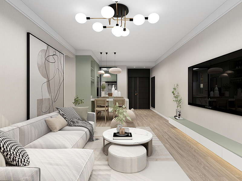 可以保留客餐厅一体布局形式,巧用沙发、餐桌等家具,或者用吊顶、吊灯等,明确客厅休闲区和就餐区的视觉分隔设计,呈现开放式布局,彰显居室的宽敞通透。