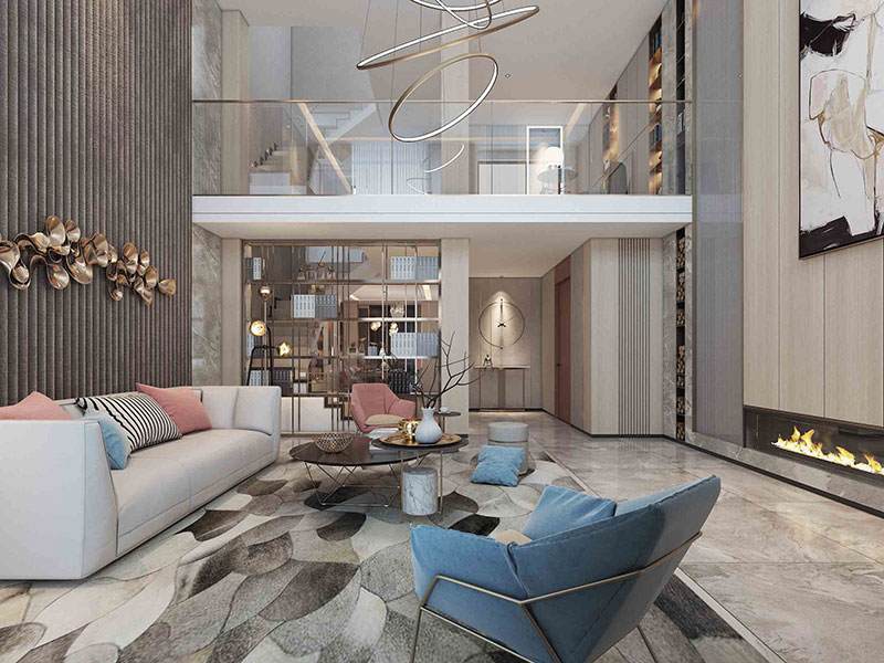 以暖灰色系做空间色彩基调,搭配金属、理石、皮革等不同材质的装饰元素,并结合多元化的光源设计,呈现雅致时尚的现代家居生活。
