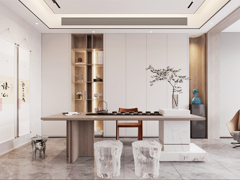 单独规划一个房间,设计茶架、摆放茶桌,搭配茶具、盆景和水墨书画等,呈现静雅禅意的茶室。