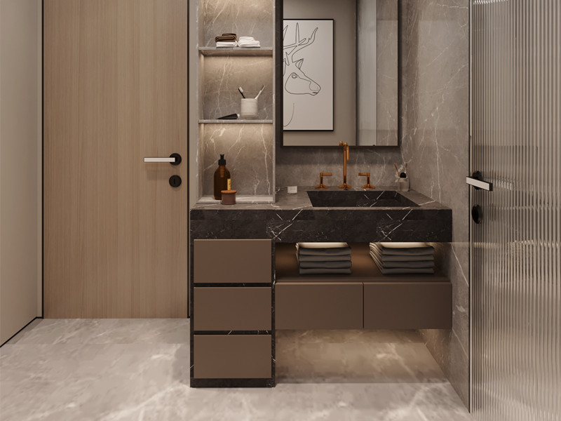 除了开窗设计,也建议采用玻璃门等通透隔断,方便让卫生间的空气与其他空间互通,从而让空气清新。