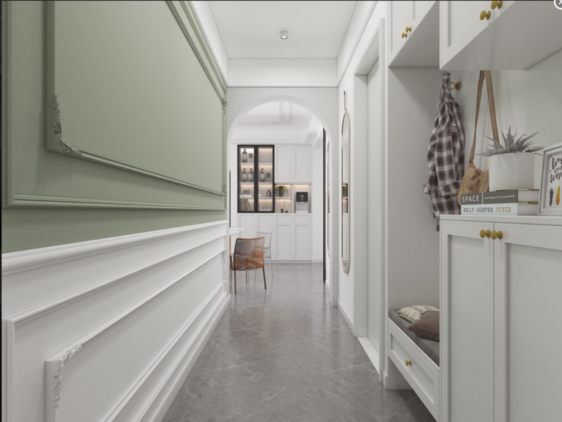 玄关区域布局收纳柜提升区域实用性,增设挂衣区与换鞋凳,居住体验更舒适,弧形造型设计让空间分区更明确。