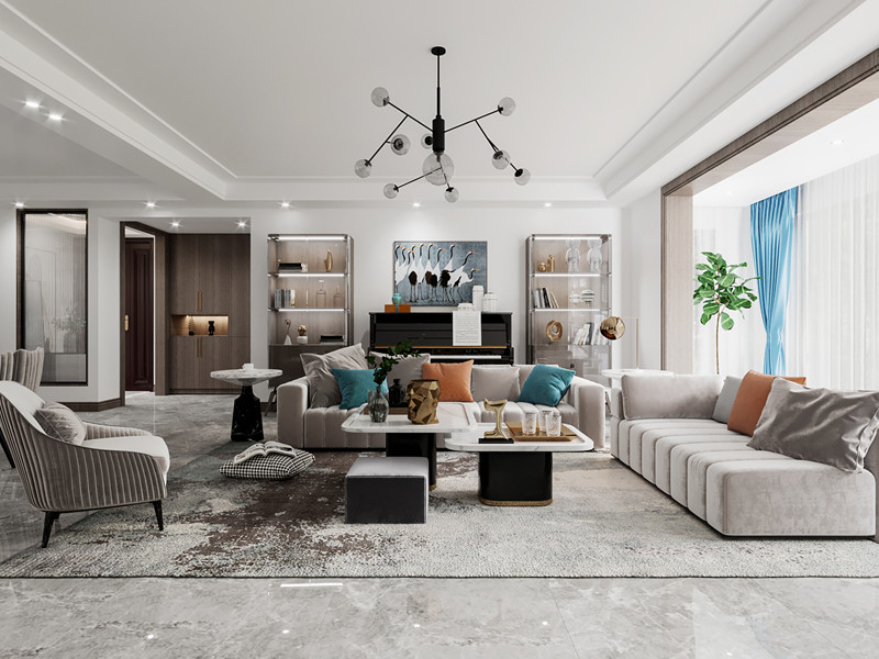 客厅设计中注重色系的搭配,浅色系沙发搭配蓝、橙色抱枕,灵动活泼。大理石茶几与金属吊灯,开放式置物架陈列饰品,背景墙挂画增添艺术氛围。