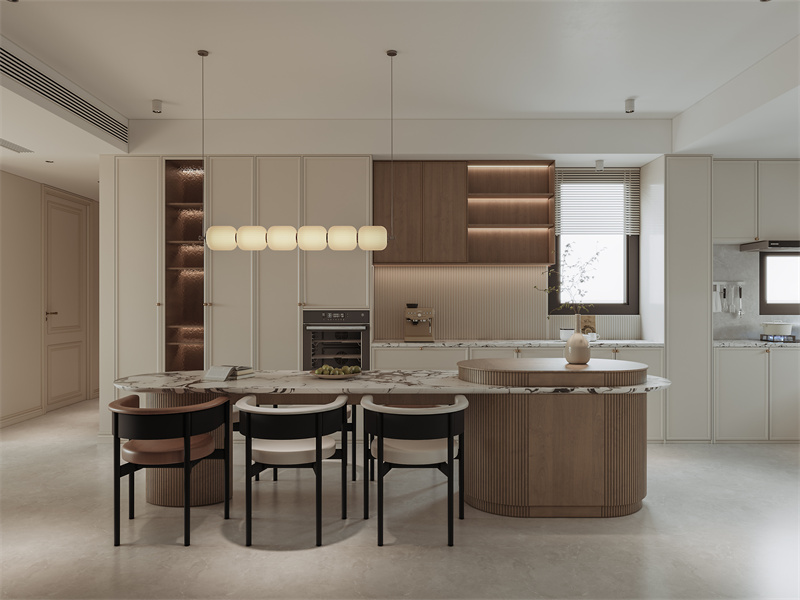 开放式布局让厨房与餐厅相连,动线流畅。居家时,可在岛台备餐,互动性强。色彩上,以暖米色、浅棕为主,搭配黑色椅腿,线条简洁,柔和又不失稳重。