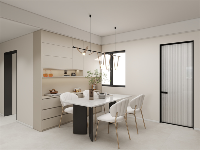 餐厅空间设计简约实用,靠墙餐边柜集收纳与展示于一体。四人餐桌椅摆放规整,营造温馨用餐氛围。整体色彩以米白、浅灰为主,清新淡雅。吊灯造型别致,增添时尚感。