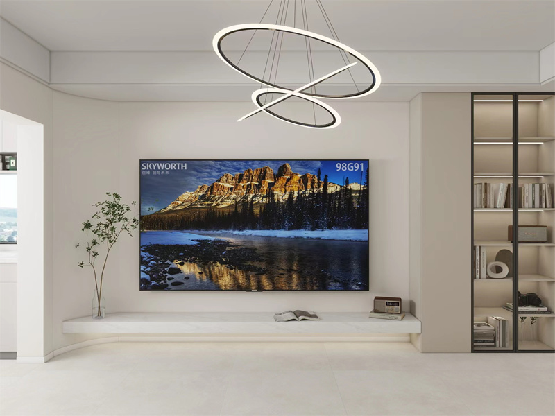 以简洁的白色为主,搭配线条感十足的吊灯与收纳架,营造出简约时尚的氛围。大屏幕电视与旁边的绿植,清爽自然整体设计既满足了功能需求,又展现出精致的生活品味。