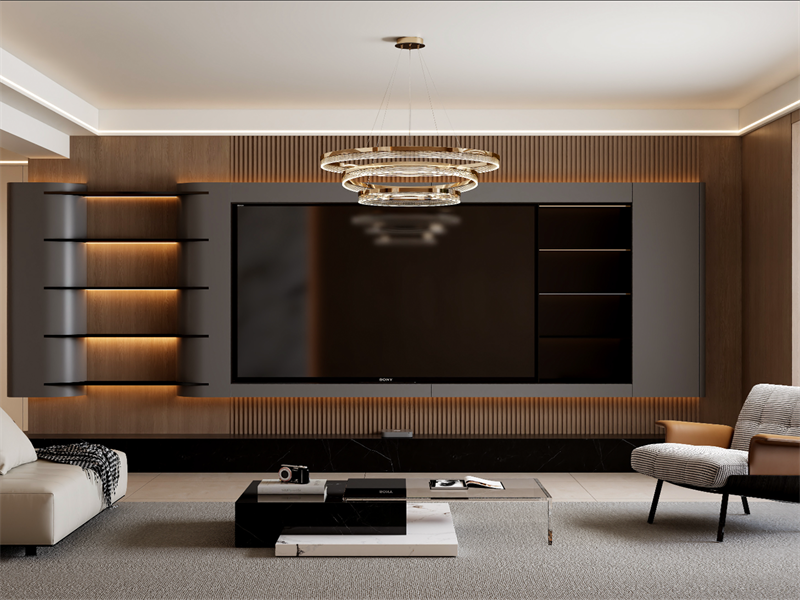 电视背景墙采用木饰面与金属线条结合,嵌入式收纳与灯光设计强化功能与美学。家具选择上,皮质沙发与布艺休闲椅搭配,玻璃茶几提升空间轻盈感。